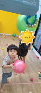 その後はボール遊びをしました。箱にタンバリンと鈴を付けて、ボールを投げて音を出すことも楽しみましたよ♪ キャッチボールも楽しみました。