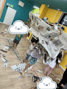新聞紙を割いたり、降らせたり、家を作ったりなどなど。