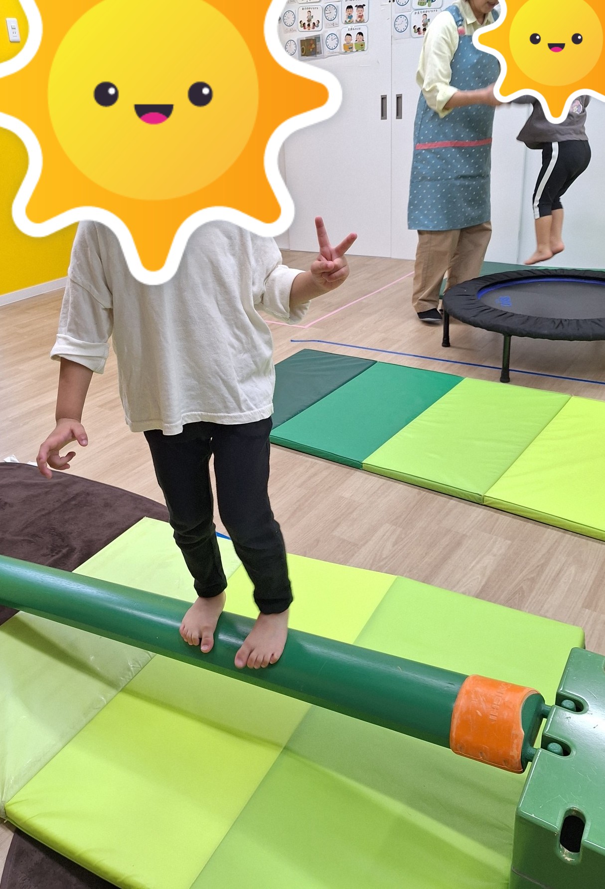午前中は、平均台・トンネル・トランポリンで体を動かしていきました。