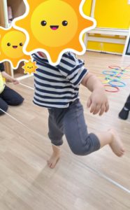 スタッフと一緒に取り組んで、ジャンプした後の足裏への刺激を楽しみました☆