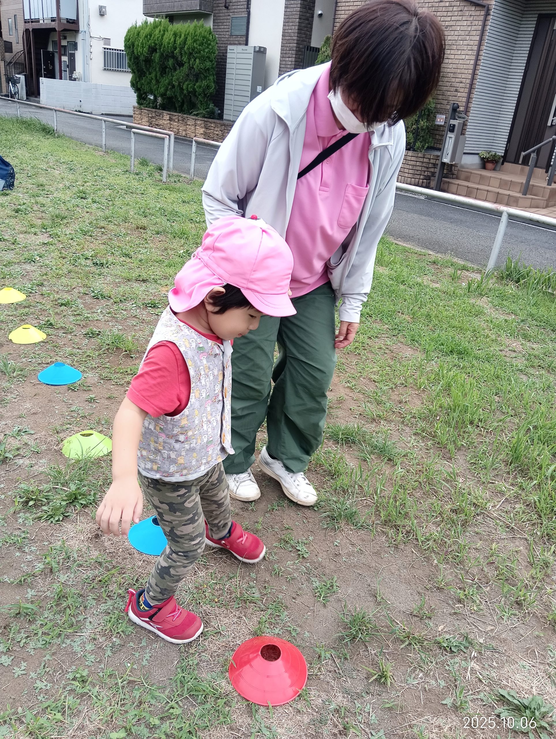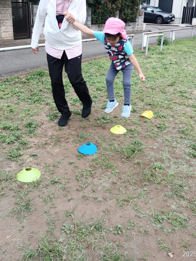 公園で走りながらマーカーの上をジャンプ!