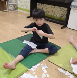 紙ちぎりに集中できる子は、ピニャータに貼る紙をたくさん作ってくれています💮