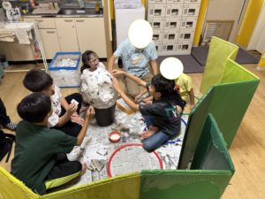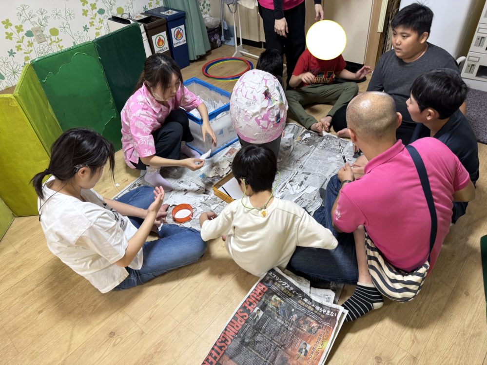 ピニャータ作り!! りぼんU 2025.10.07 こんにちは。 今日のりぼんUはピニャータ作りとぬり絵に紙ちぎりを2グループに分かれてやりました🥚紙貼りではお友達と協力しながらボンドをつける人、紙を貼る人など楽しそうにやってくれました🎵 ぬり絵もハロウィンにちなんだ絵を何色で塗ろうかな・・・と言いながら淡色やカラフルなど様々なぬり絵になっています(⌒∇⌒) りぼんU