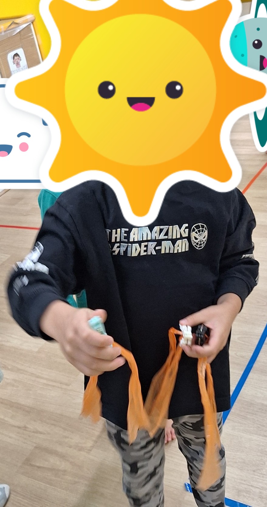 今週の活動は活動は、しっぽ取りをしています。洗濯ばさみにスズランテープを付けてしっぽにして、お尻に付けます。そのしっぽを取られないようにして逃げたり、お友だちを追いかけてしっぽを取ったりしました。ルールが難しいお友だちもいましたが、みんなで走ることは楽しかったようです。少しの色で2チームに分かれて相手の色のしっぽを取ることも楽しみました♪