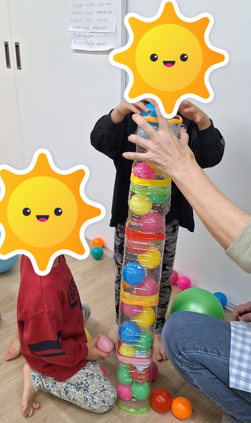 その後はボール遊びをしました。大きいなボールでキャッチボールをしたり、ペットボトルで作った筒の中にボールを入れたりして遊びをしました。