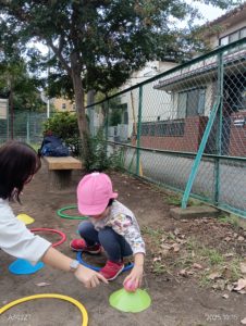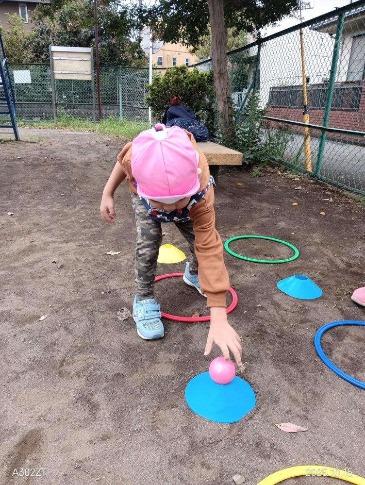 午前のボール渡しはわっかの中に入って、マーカーの上のボールを