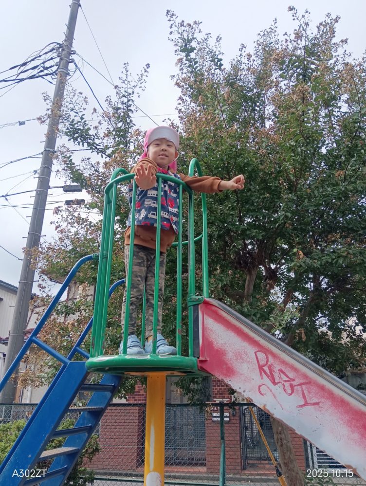 すべり台の上から手を振ってくれたおともだちです(*´ω`)