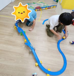 その後の自由遊びで大きいお友だちが協力をしてレールを長く繋げてあそんでいました✨とても楽しい遊びの時間になりました。