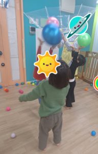 その後はボール遊びを楽しみました。スタッフ手作りのペットボトルのボール転がしを使って遊んだり、傘にボールを投げたりしていきましたよ♪