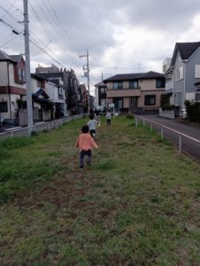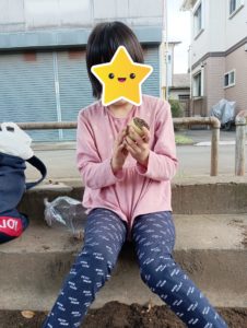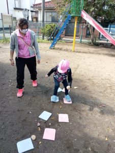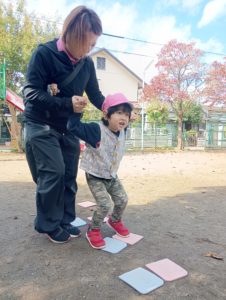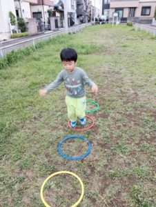 地面に置かれたフープの中にジャンプして進む活動でしたが、みんな膝を曲げて、リズム良くジャンプしていました!