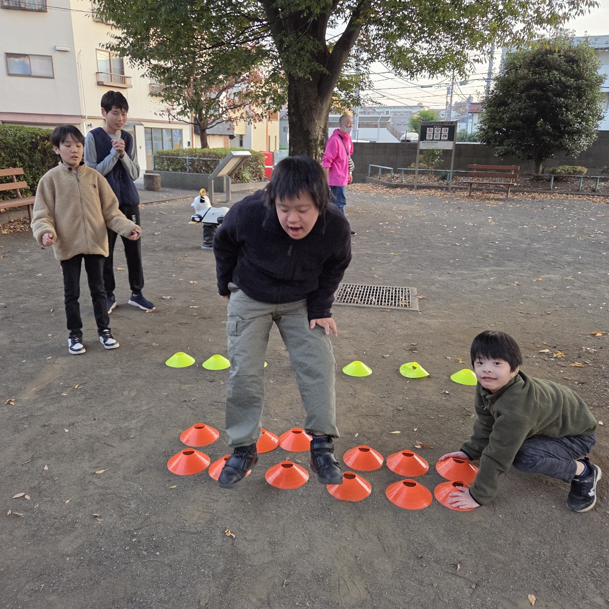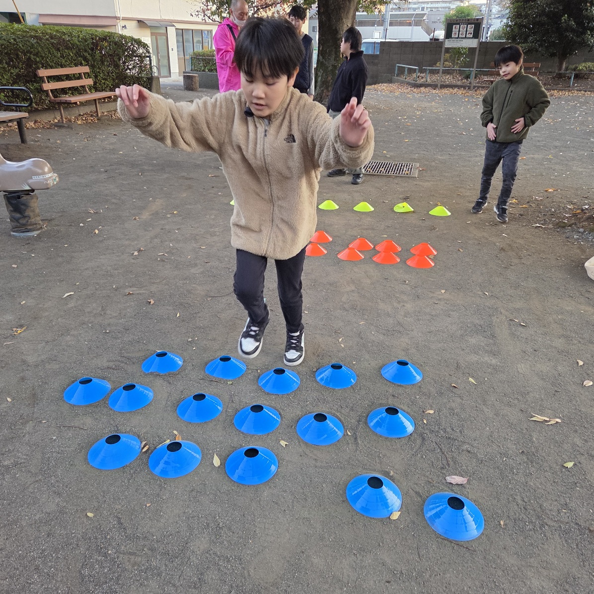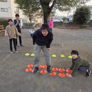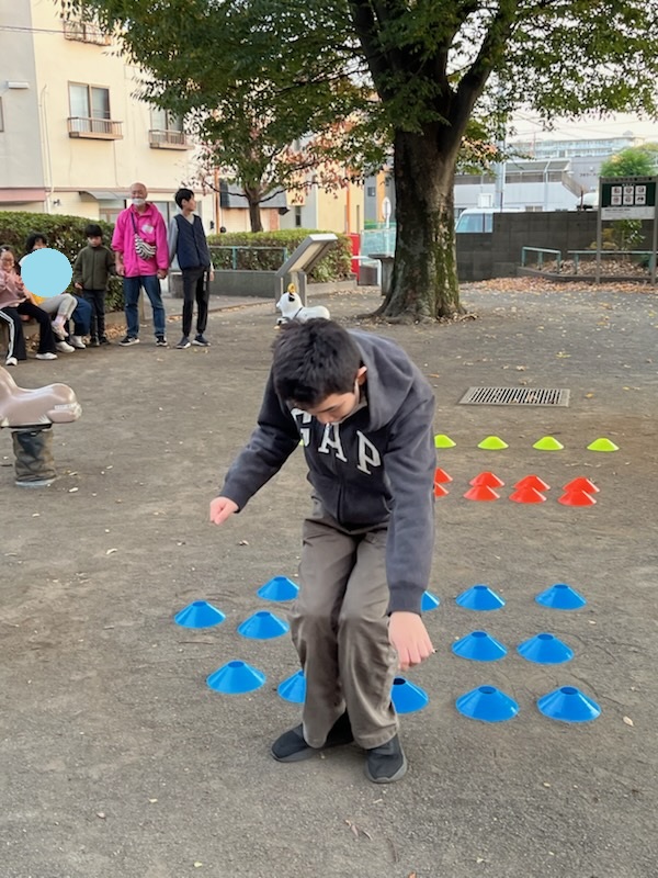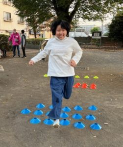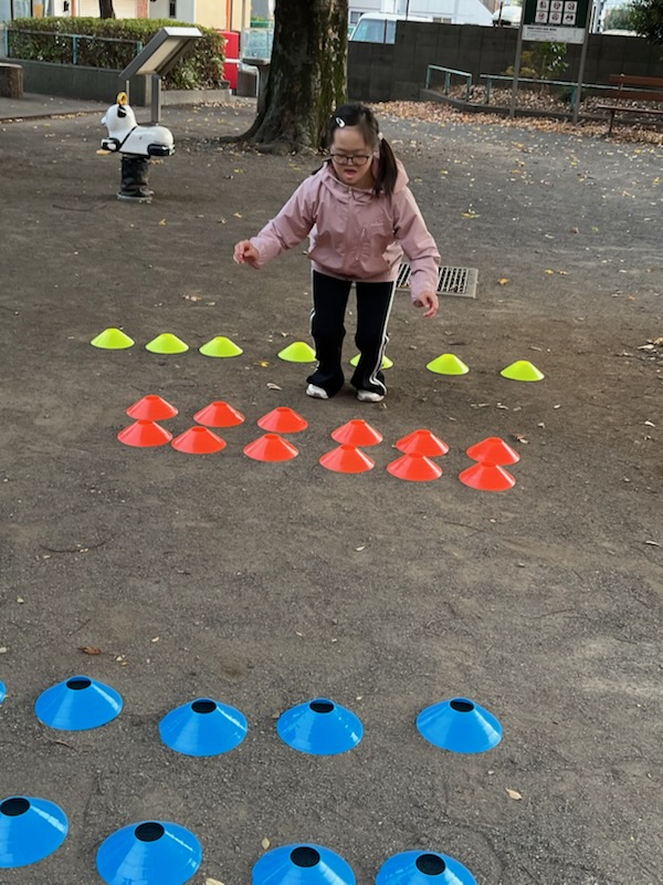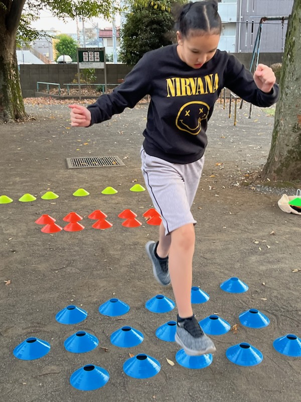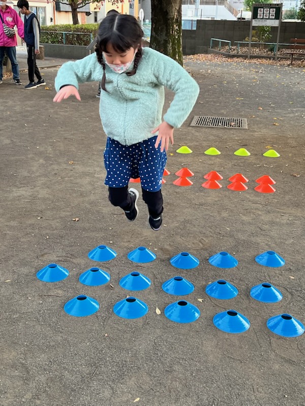 いつもは1列ずつの数列を軽くピョンピョンと飛び越えるのですが、、、今日は、1列、2列、3列とマーカーが並んでいるので、最後は勢いをつけて大ジャンプをしないと、越えられません😨(笑)
