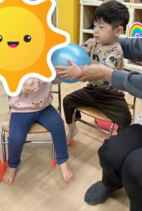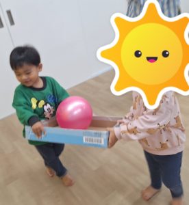 まずはじめにみんなで輪になってボール回しをしていきました。「お隣りへ🎶」のお歌に合わせて楽しみましたよ。