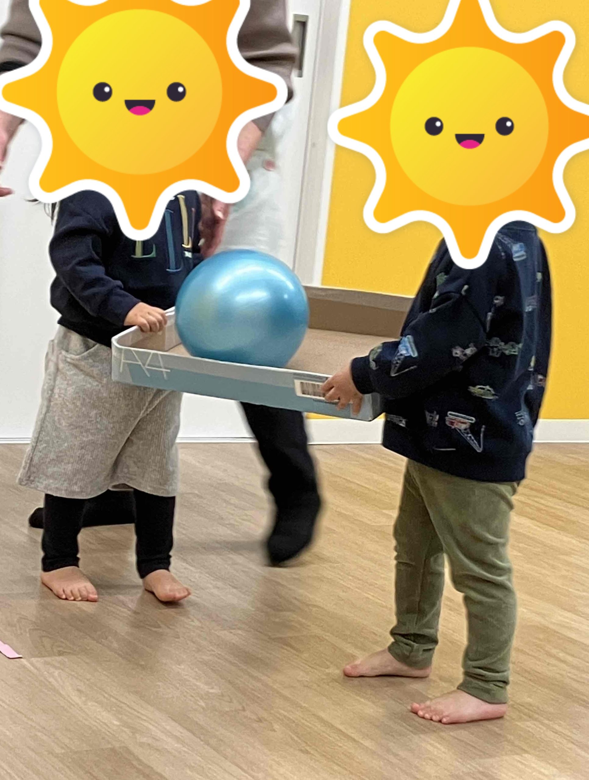 次にボール運びレース。2人1組になり箱の中にボールを入れて落とさないように運びました。