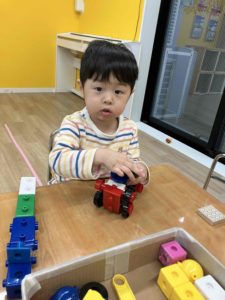 コーナー遊びでは、積み木、マグネット、色形ブロックを出しました。
