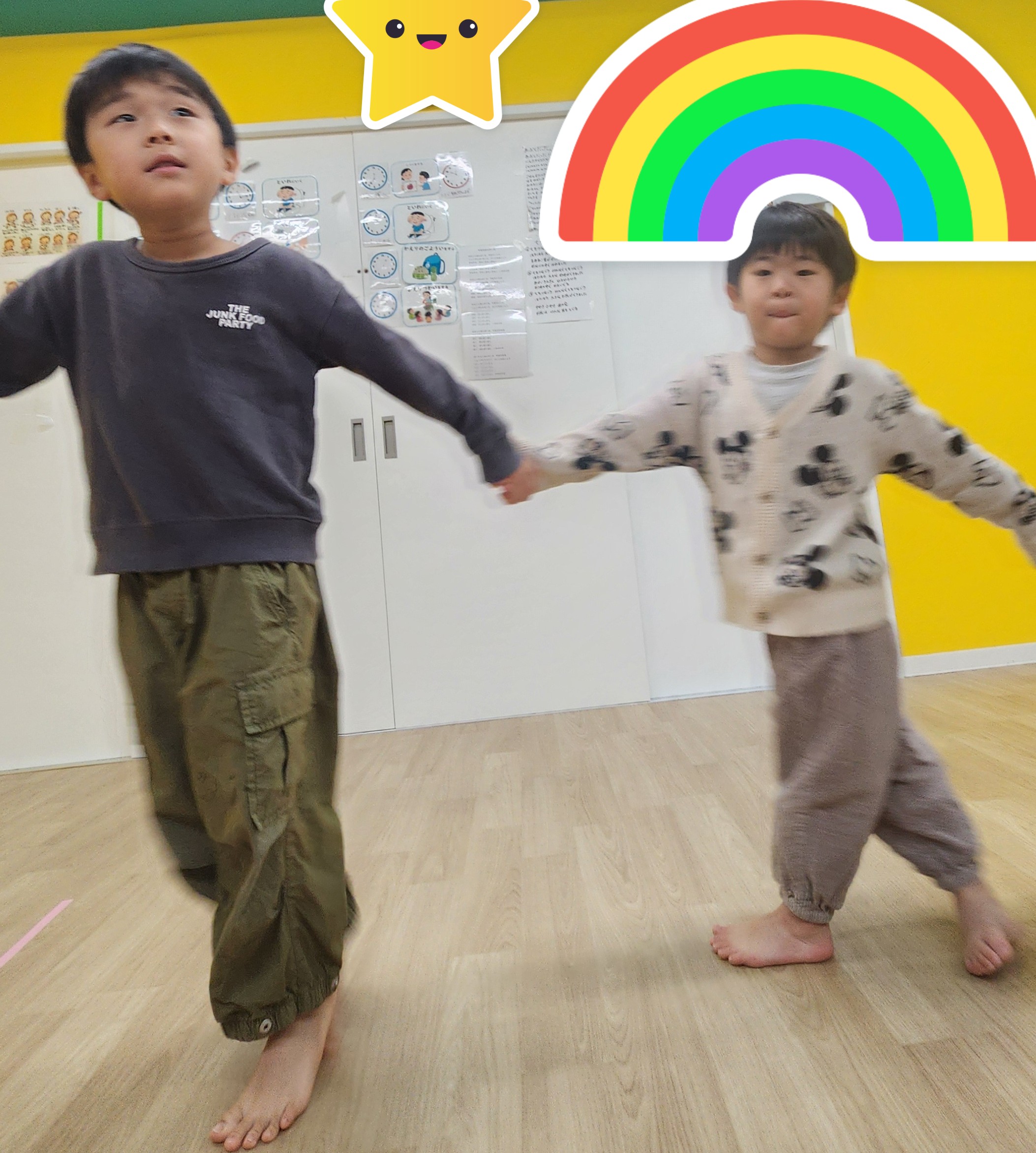 今日も朝の時間にみんなで電車のようにつながり、お歌に合わせて歩いていきました。全員で繋がることができ、周りのお友だちとペースを合わせて歩くことができましたよ✨