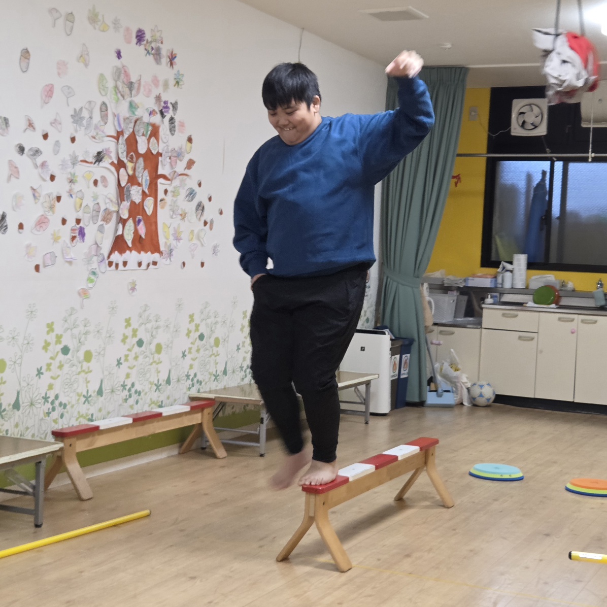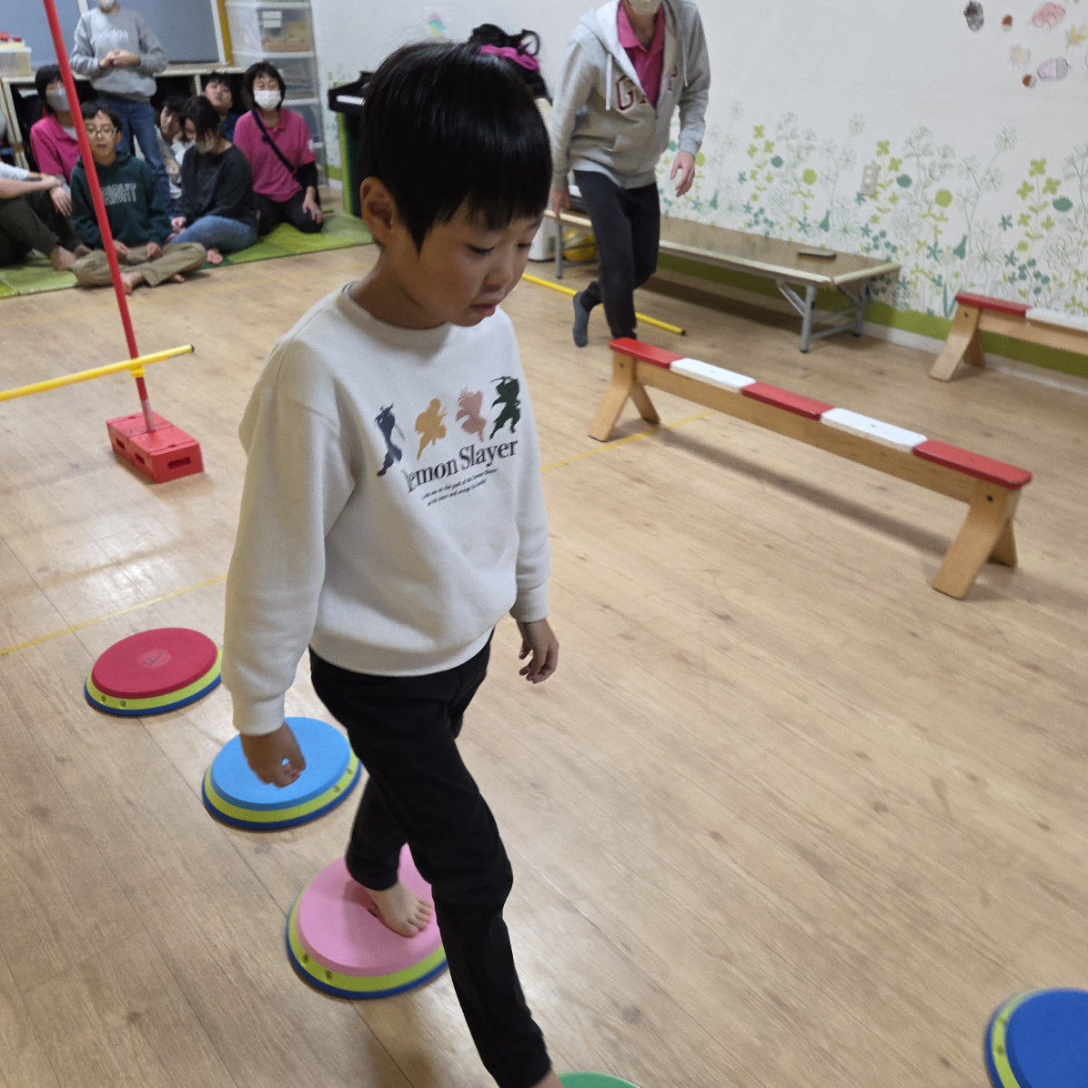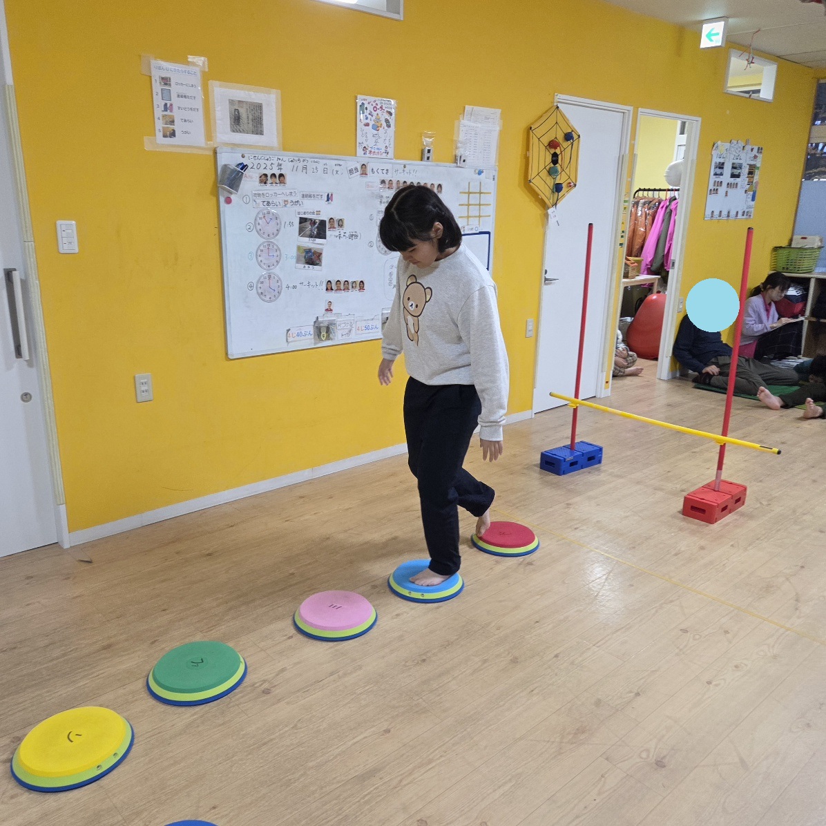 サーキット遊び! りぼんU 2025.11.25 今日は早く到着したチームは、傘をさして、おやつ買いを兼ねたお散歩に行ってきました✨ ずっと小降りの☔雨だったので、みんなが揃ってからは、室内でサーキット遊びをして体を動かしました✨✨ 最後のコーナーでは、どんぐりの付いたボールを取って、どんぐり拾いをしてゴールする流れが、楽しかったようです😊♪ りぼんU