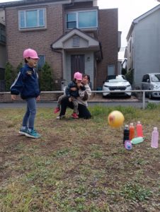 公園では色水が入ったペットボトルをピンにして、ボウリングをしました。