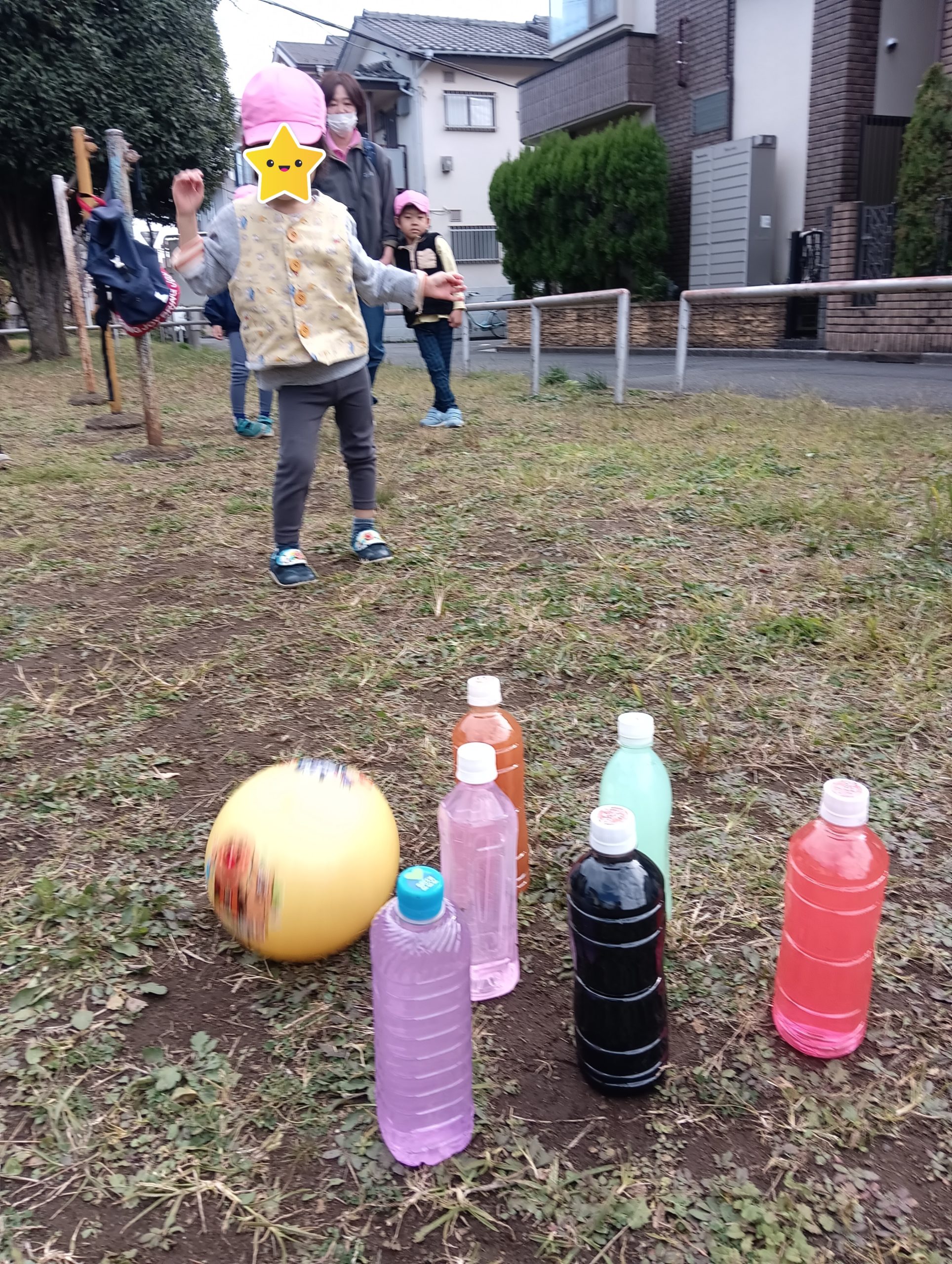 公園では色水が入ったペットボトルをピンにして、ボウリングをしました。