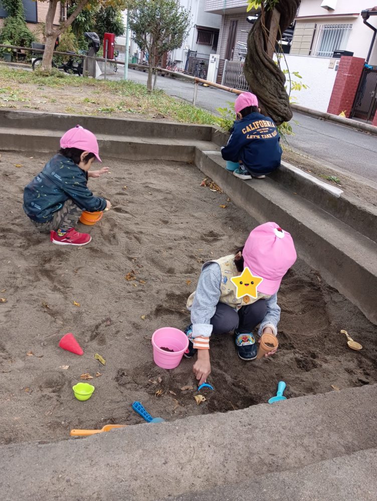 みんなですべり台で盛り上がった後、砂遊びをして落ち着いていました(*´▽`*)