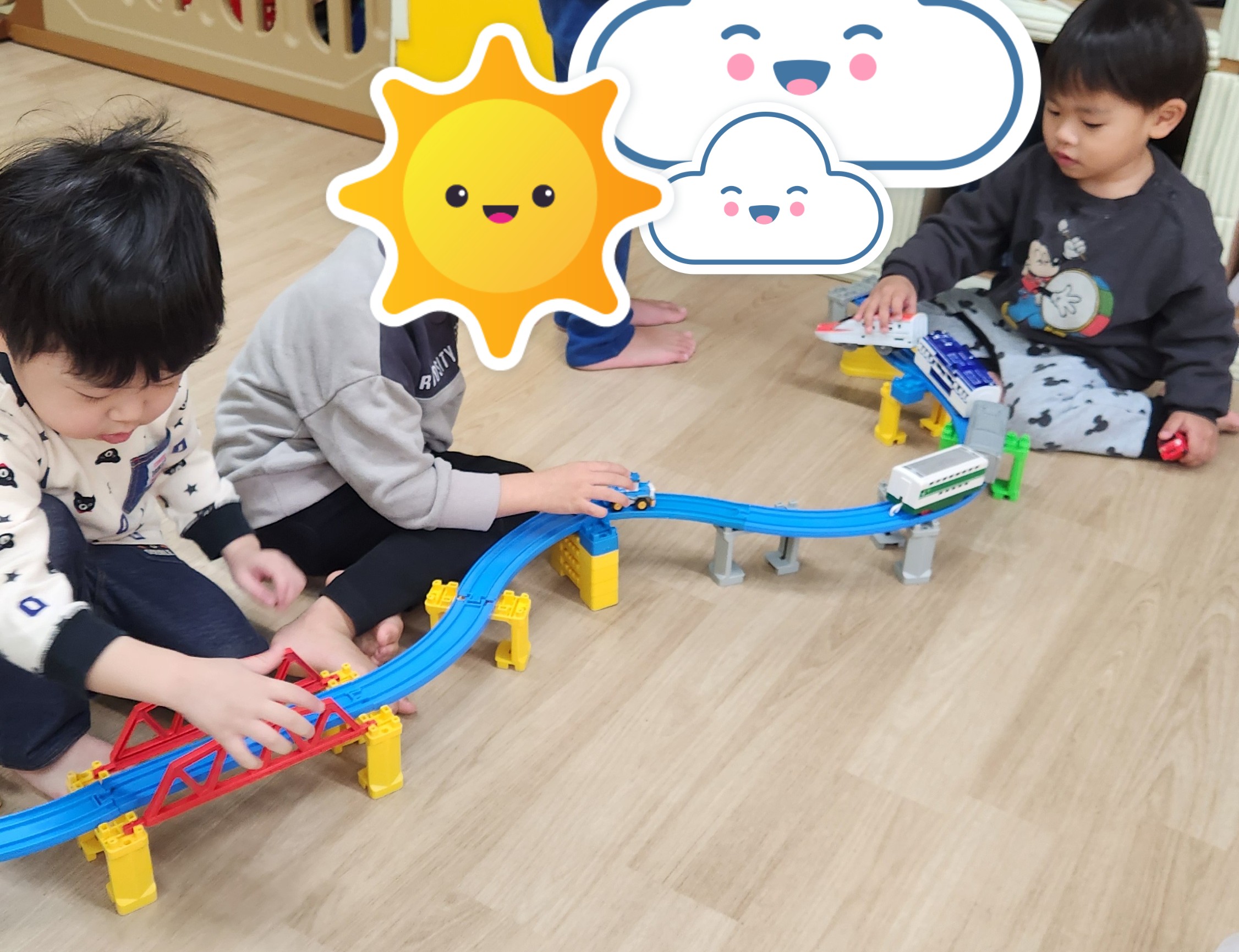 自由遊びの時間にお友だちと一緒にプラレールで遊んでいましたよ。電車を走らせて楽しそうでした♪