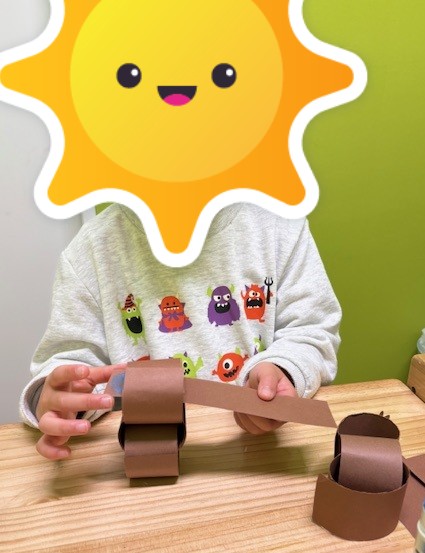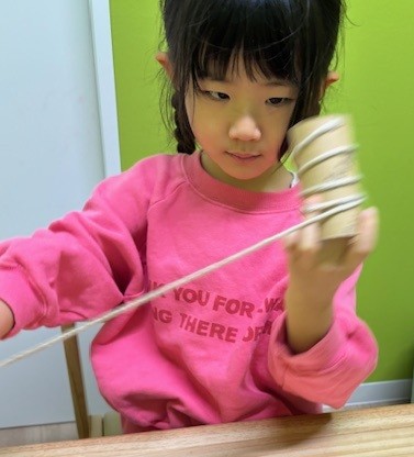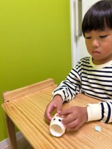 午後は個別活動とペガーボールをしました。ペガーボールは、ボールを傘を逆さまにした中に投げ入れたり、段ボールの滑り台で転がしたりして遊びました。