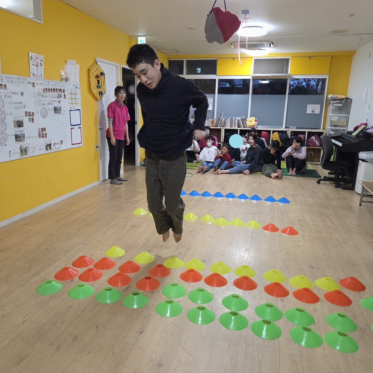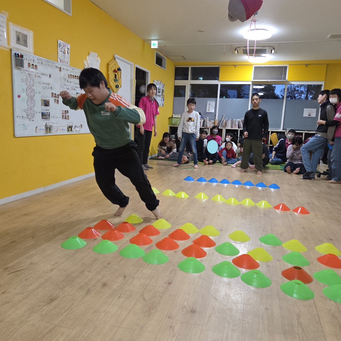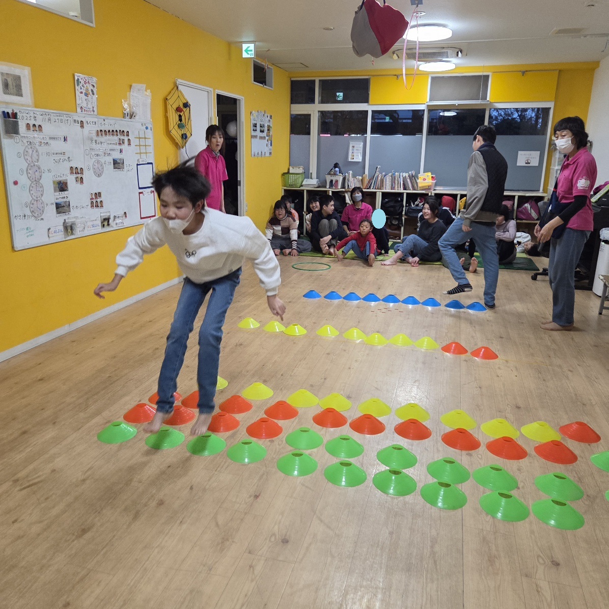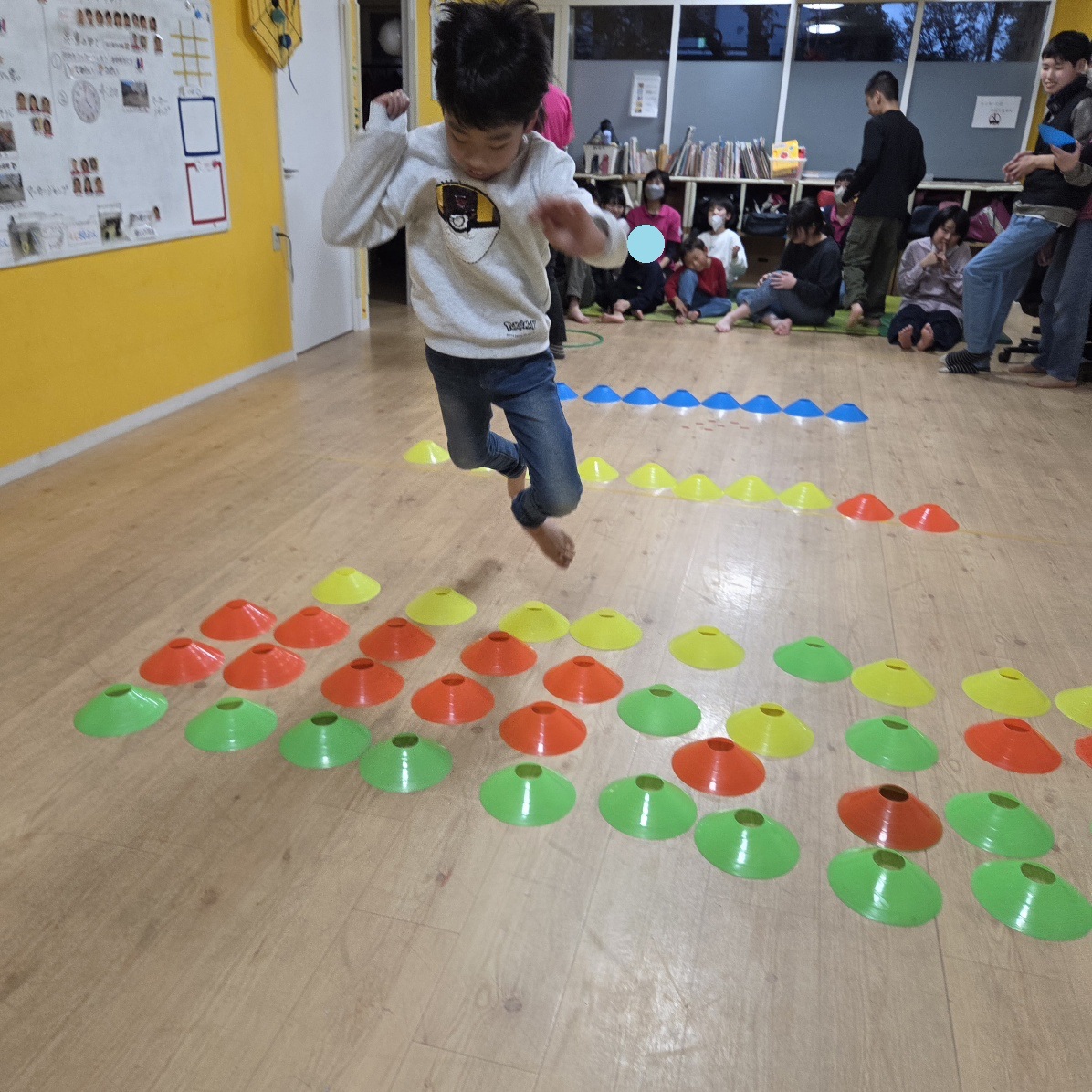 全員が揃ってからは、雨が降ってきてしまったので室内で、(前回好評だった)マーカージャンプをしました🎵
