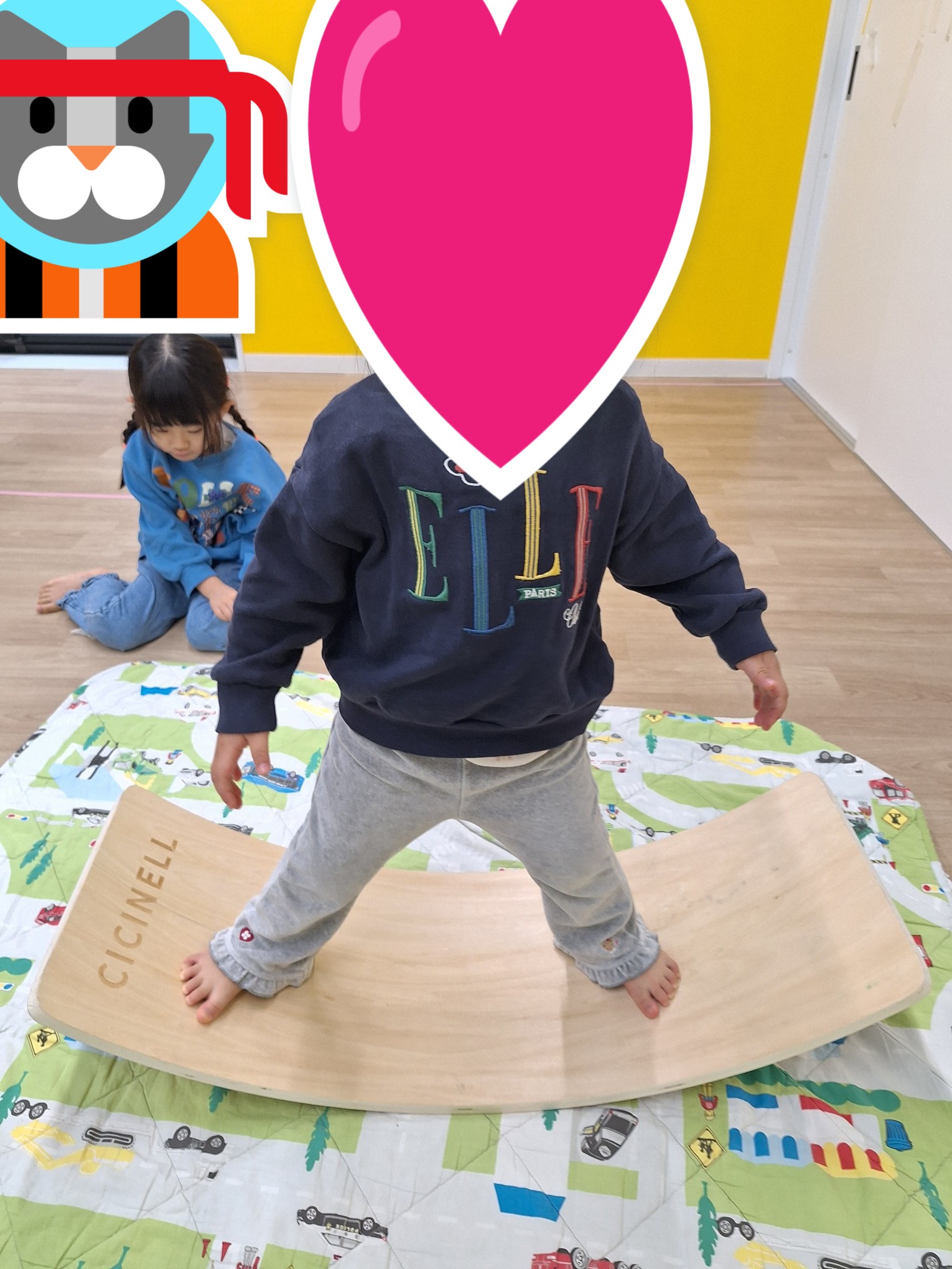 バランスボードで、体幹を使っています。