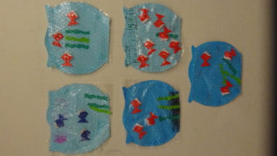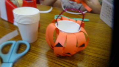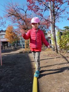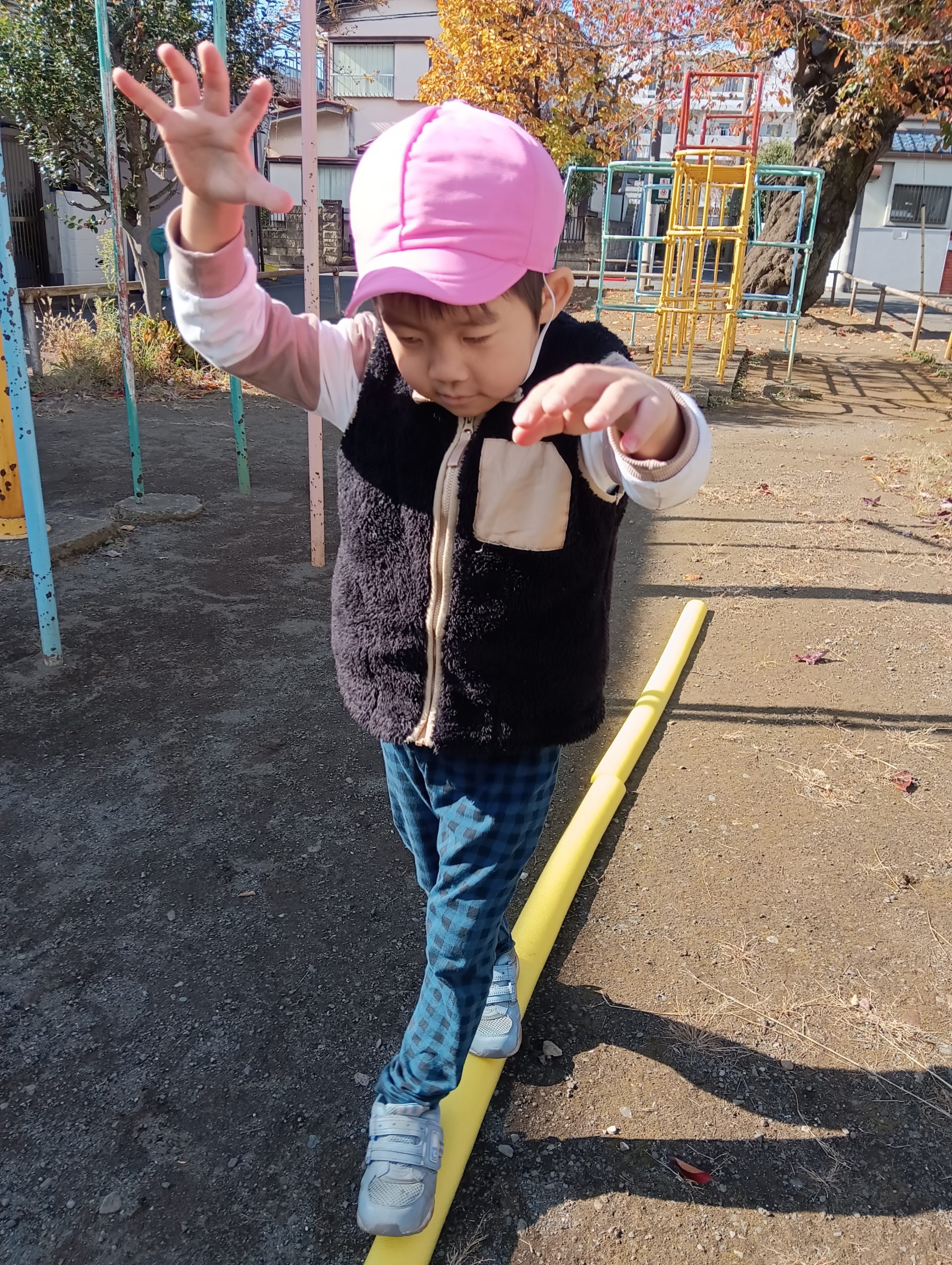 午前の活動ではプールスティックを半分に切ったものの上を渡る、丸太渡りをしました!