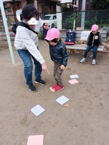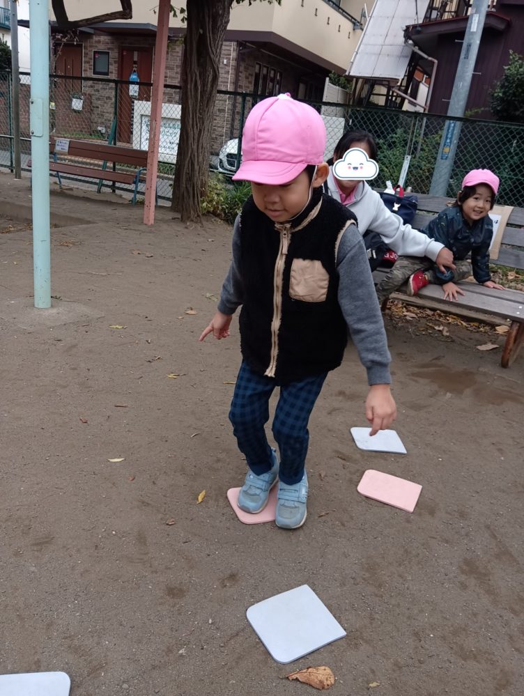 午前の公園での活動では、フラットマーカーの上をジャンプして移動する島渡りジャンプをしました!