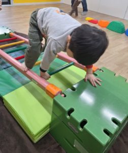 今日は、梯子、トンネル、バランスストーンを行いました。梯子はスタッフと一緒に手をつないで渡ったり、手をついて四つん這いになって渡ったりしていましたが、段々と一人で上手に立って渡れるようになってきています。バランスストーンも一人でバランスを取って落ちずにストーンの上を歩けるお友だちはが増えましたよ。