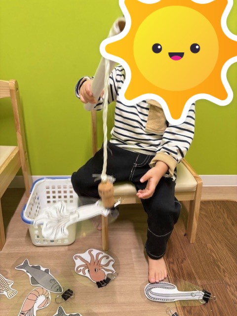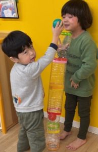 その後は、ボール遊びをしました。逆さまにした傘にボールを投げ入れたり、ペットボトルの長い筒にボールをたくさん入れたり、大きなボールでキャッチボールをしたりして体を動かしました。今日は、ボールのお片付けがとっても速く上手に出来ましたよ。