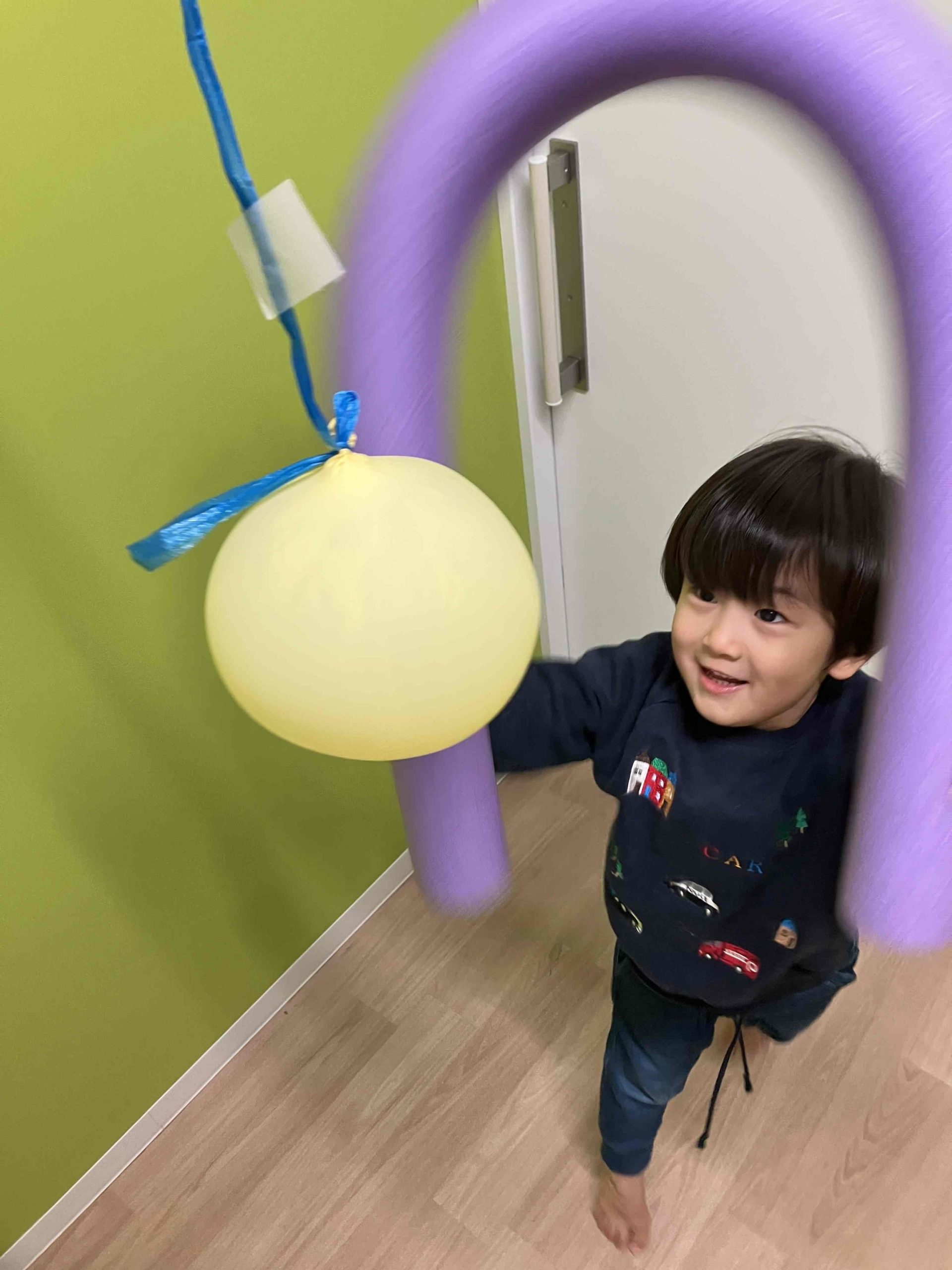 スティックを風船にあてていきました。この動きを通し縄跳びを跳ぶ練習をしています。
