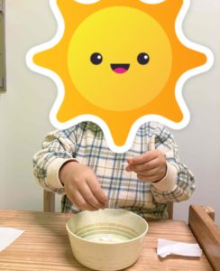 この活動を通し、ボタンを入れたり引っ張たりする動きの練習をしています。