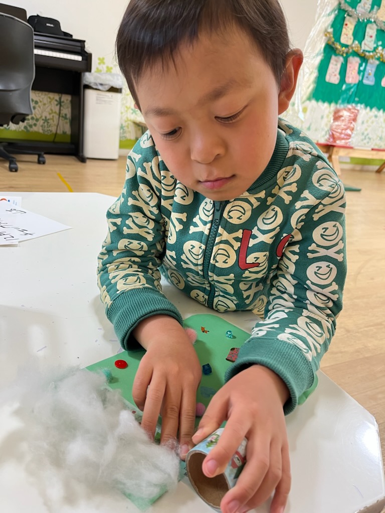 クリスマス工作と、手つなぎジャンプ👐! りぼんU 2025.12.19 今日は、クリスマス工作の仕上げと🎄、公園では手つなぎジャンプをしてきました!✨✨ ツリーや壁面制作の飾り付けをしながら、クリスマス気分も盛り上がり、いよいよ楽しみな子ども達です🎄✨✨ 手つなぎジャンプは、みんなで手をつないで「せ~~~の!」でタイミングを合わせて一緒に縄を跳ぶというものです👀 自分だけで跳ぶのではなく、みんなで合わせるという所がポイントです👍 ちゃんと横のみんなを見て、合わせて跳ぼうとしていました💮😊 りぼんU