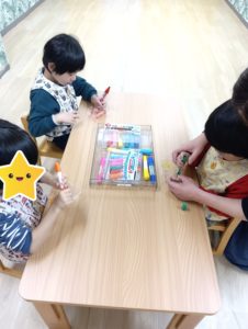 その後はクリスマスの工作に取り組み、クリスマスツリーになる部分の色塗りをしました(^^)/