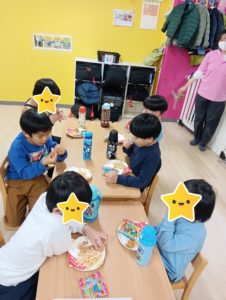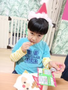 午後はみんなでおやつを食べました。クリスマスイヴなのでお皿にはサンタさんのナプキンを敷いてクリスマス気分を味わいました(*´▽`*)