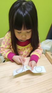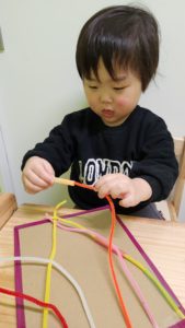 個別では、図形ブロックや、はさみとのり、モール通しを行いました。