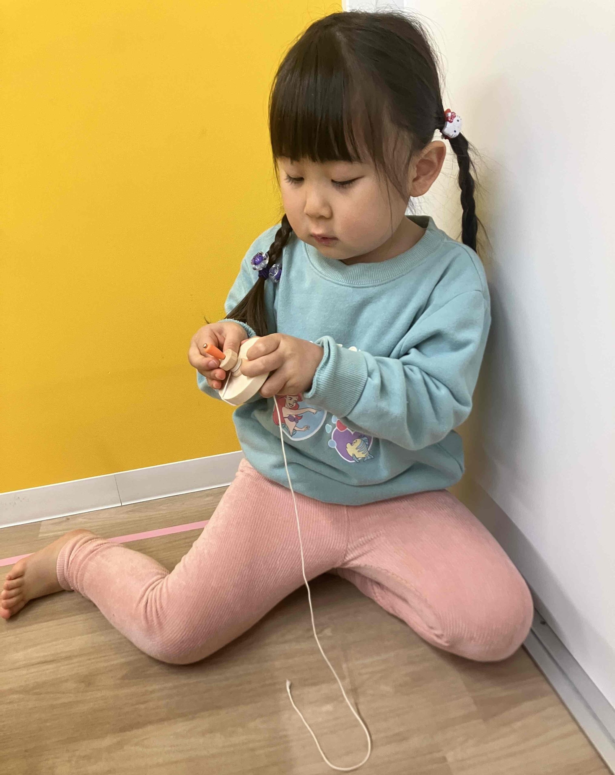 コマでは紐をまいて引っ張て回すタイプのコマにも挑戦をしていきましたよ✨何度も挑戦をし、一人で回すことが出来るようになったお友だちもいました!
