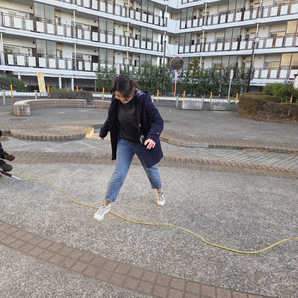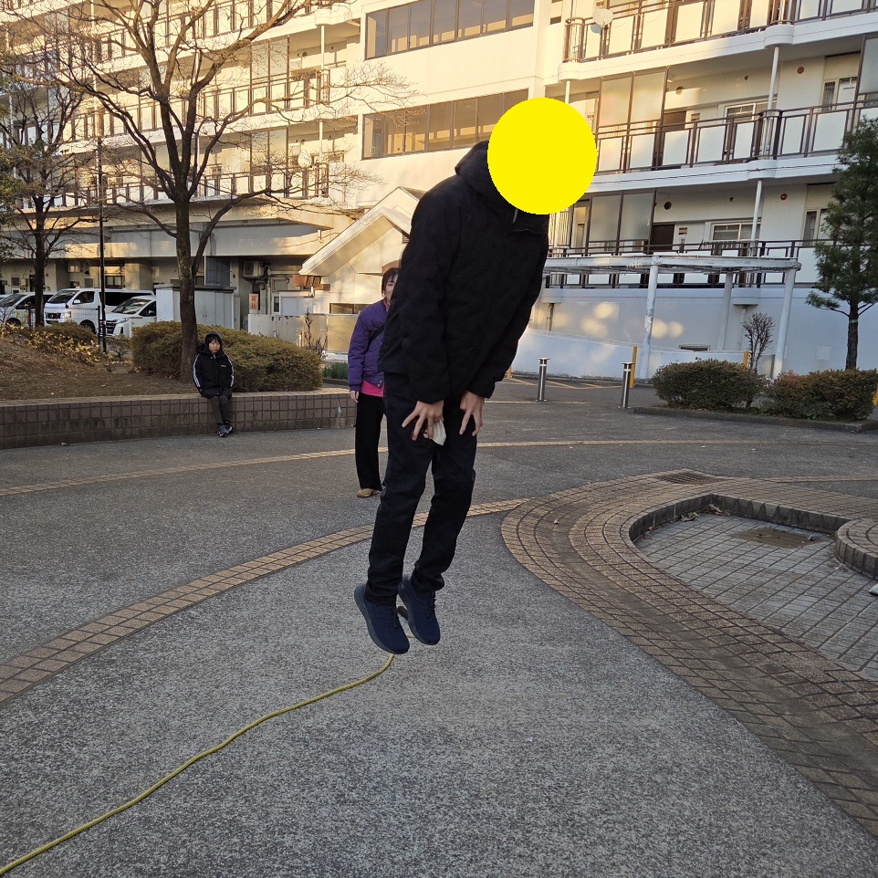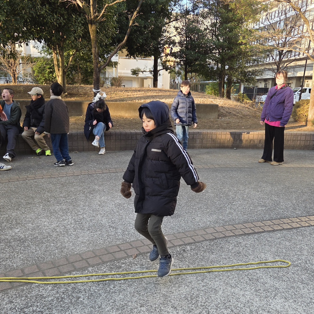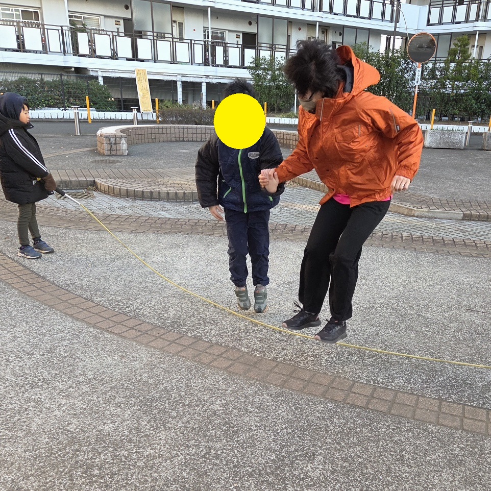 なわとびジャンプ! りぼんU 2026.01.13 こんにちは。 今日のりぼんUは公園でなわとびジャンプをしました!はじめは一直線に置いてある縄跳びを両足ジャンプ、次に少し揺れている縄跳びをジャンプ、最後に波々の縄跳びをジャンプと3パターンにチャレンジしてもらいました😊置いてある縄跳びはみんな問題なく跳べたのですが、動いている縄跳びをジャンプするのはタイミングが難しいようで跳ぶのを躊躇しているお友達には、みんなで『せーのっ!』と声掛けすると上手に跳ぶことができていました🎵 りぼんU