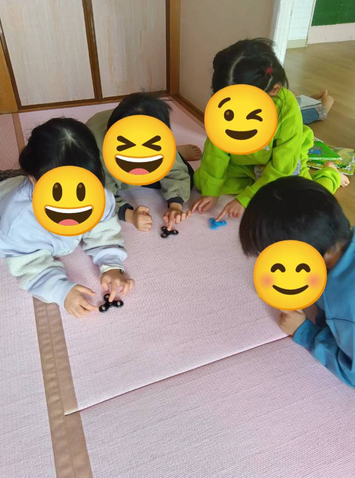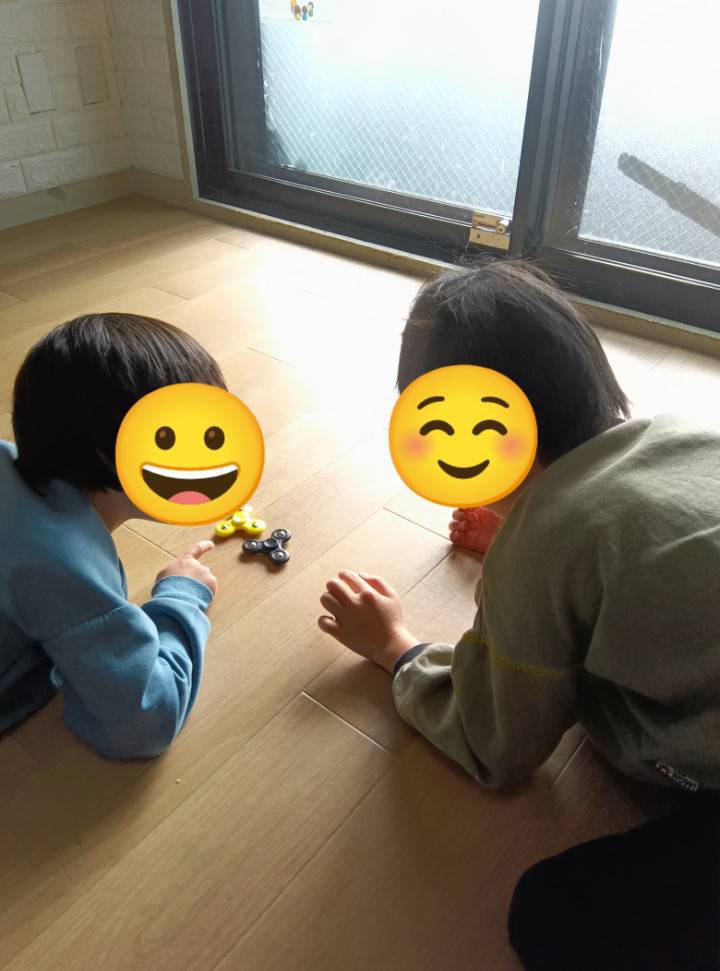 ハンドスピナー🌬️ ワクワク 2026.01.15 こんにちは。 美味しいお弁当を食べた後は絵本を読んだりパズルをしたりゆっくり過ごしています。 2人のお友だちがハンドスピナーで遊んでいると、、、 楽しそうな様子を見て女の子も参加し だしました。一緒に遊ぶと楽しいしね♪ やまもと