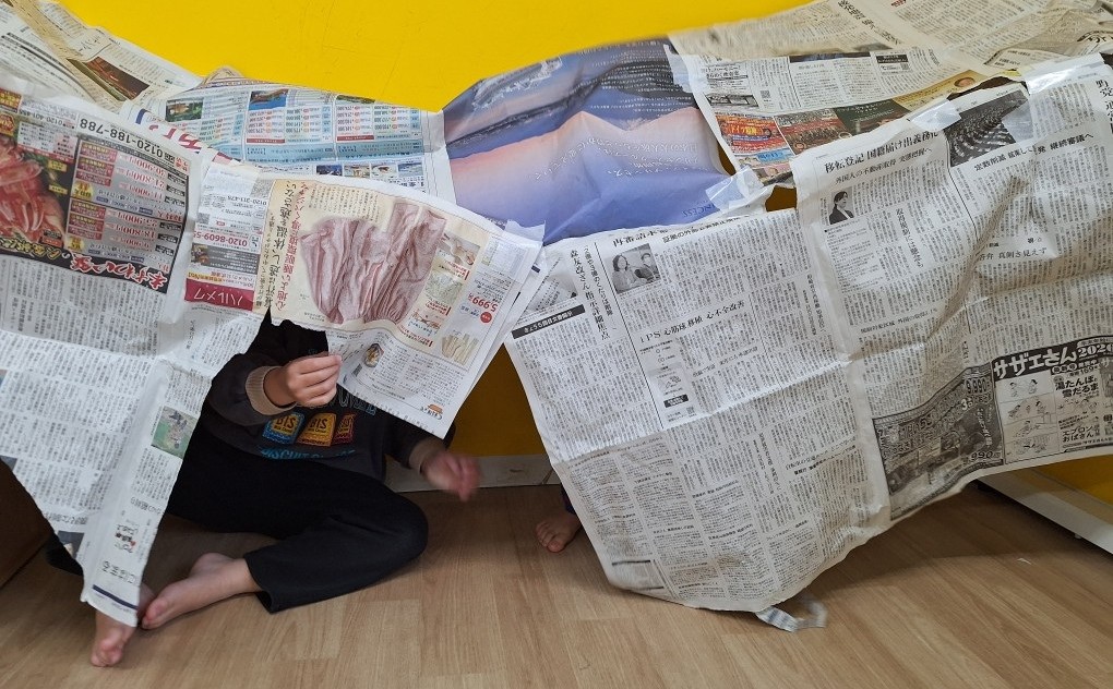 その後は新聞遊びをしましたよ。ちぎったり、作ったりして楽しみました。お家を作ってみんなで入ることも楽しんでいましたよ。