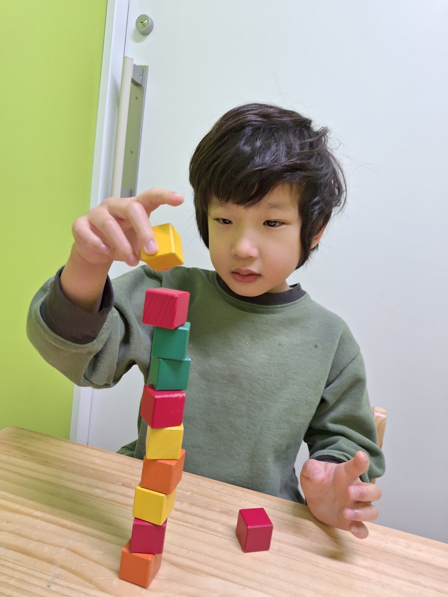 午後は個別活動とコーナー遊びです。コーナー遊びでは、お絵描き、ペッタブロック、積み木をそれぞれの興味に合わせて行いました。