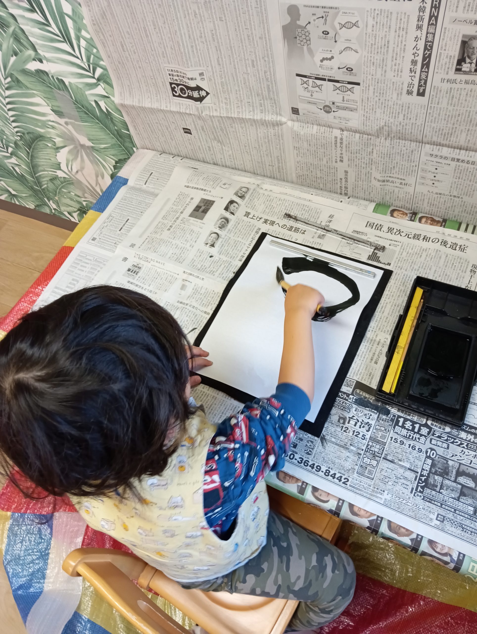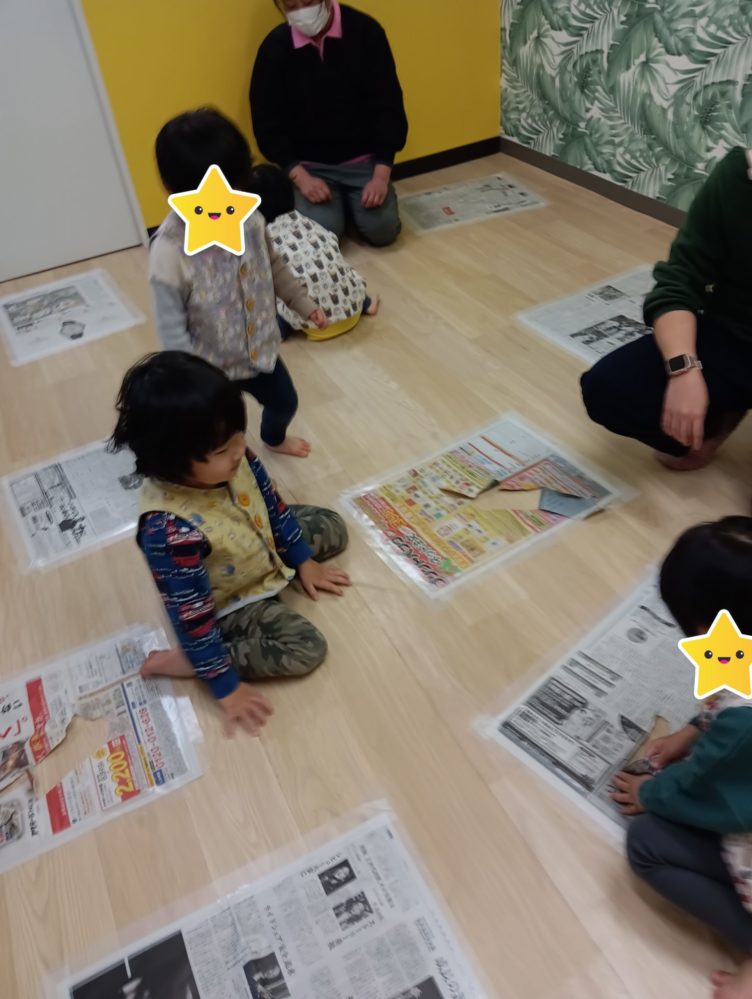 午前の干支探しゲームは、床に沢山貼られた新聞紙が!