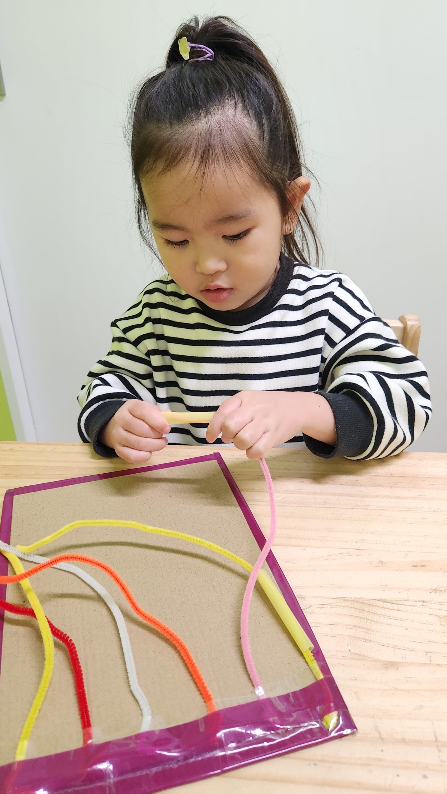 個別活動ではモールにストローを通して、指先を使った遊びや、図形に親しむ遊びなどに取り組みました。