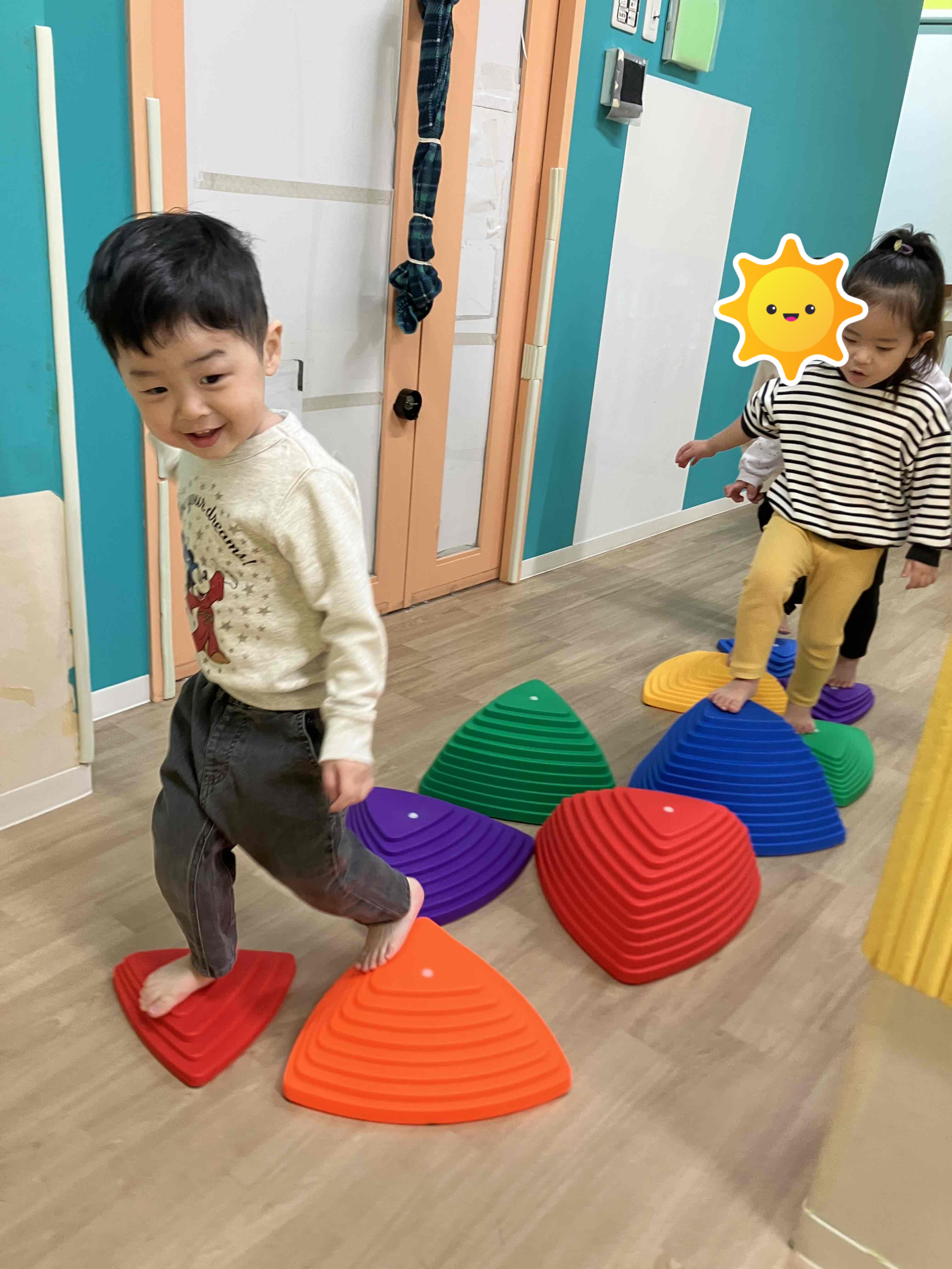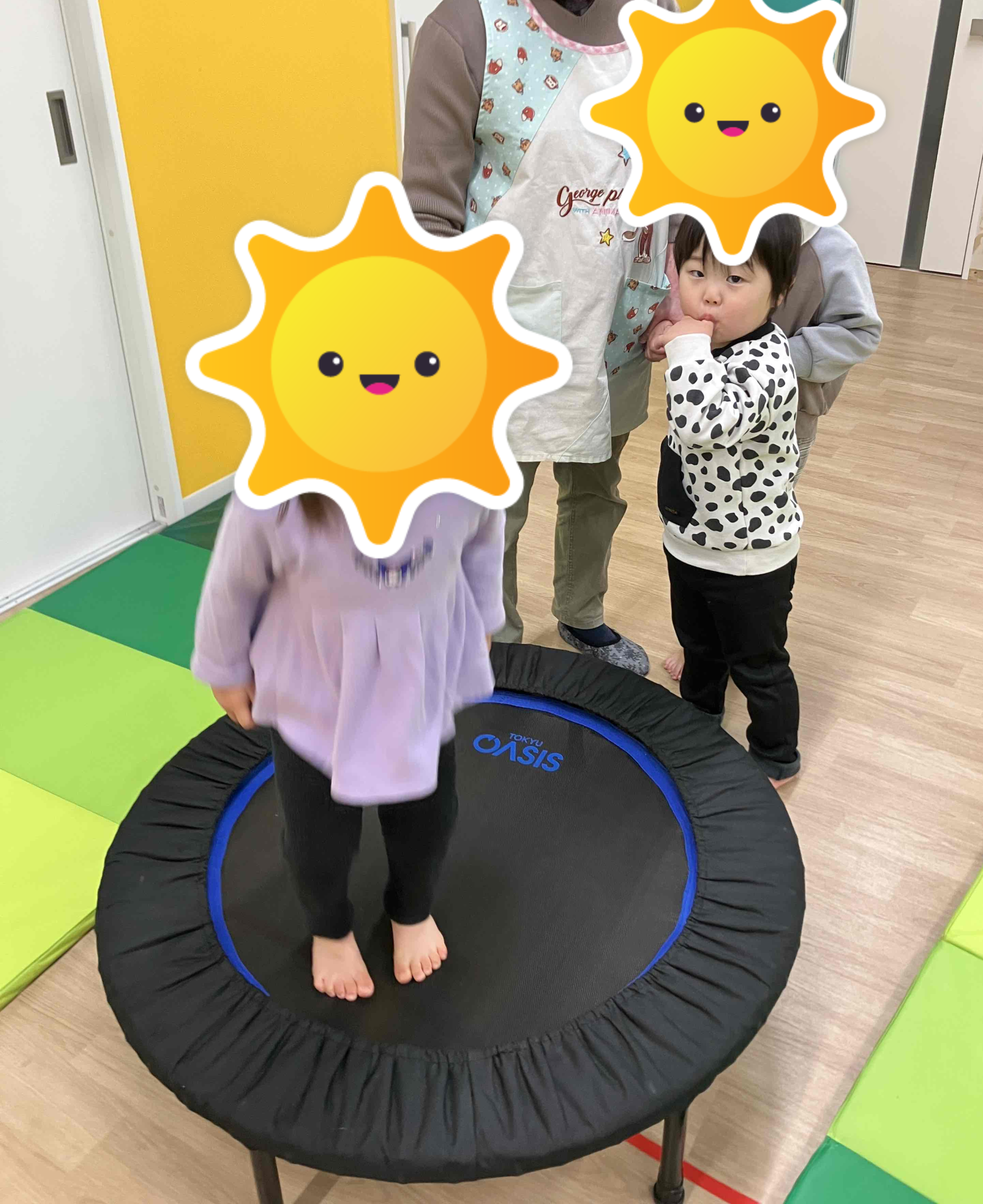 今日は平均台、バランスストーン、トランポリンを使って体を動かしました。