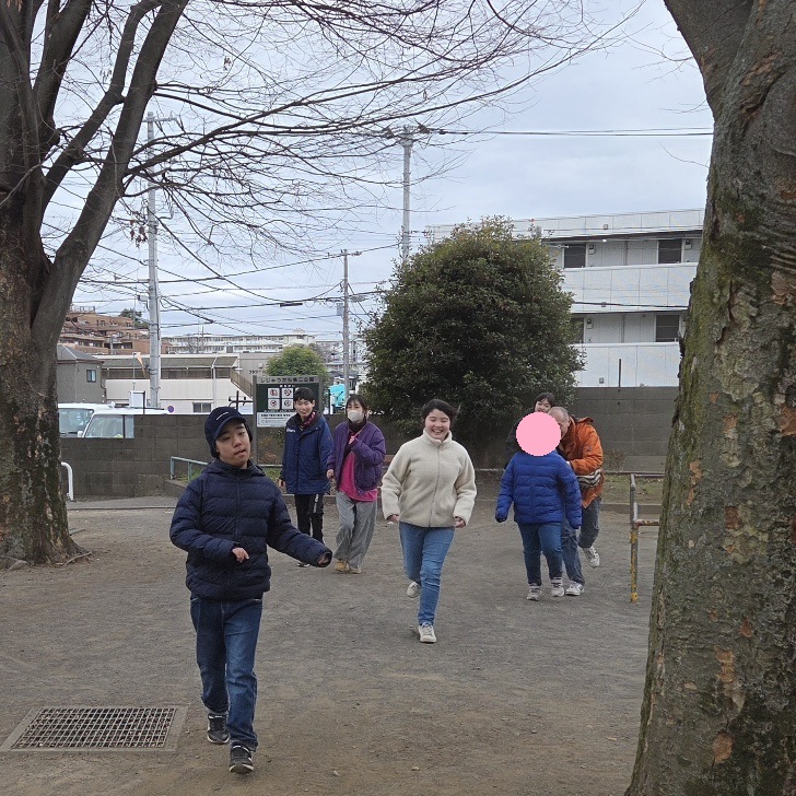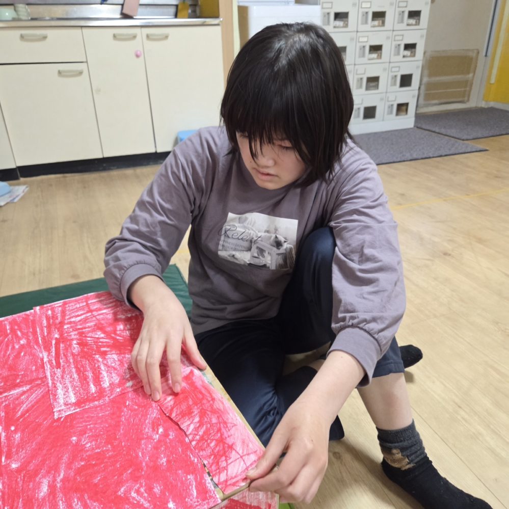 マラソン🏃 りぼんU 2026.01.29 こんにちは。 昨日のりぼんUは室内で節分工作をしました👹段ボールの両面テープを剥がして赤く塗った紙を角を合わせながら貼りました😊両面テープを剥がすのが難しいようでしたが何度もチャレンジしてキレイにはがせるようになりました✨ 公園では外周を自分のペースで3周走るマラソン🏃をしました!早いお友達は徒競走?!みたいなスピードで走っていました🎵 りぼんU
