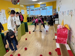 節分ウィーク👹! りぼんU 2026.02.03 節分ウィークということで、今日は、赤チーム&青チームに分かれて、節分ゲームをしました!✨✨対抗戦ということで、とっても盛り上がりました💮 張り切って強めに投げると、ボールが鬼の口からこぼれ出てしまい…なかなかの難易度に仕上がっておりましたが(笑) 子どもたちもやりながら考えて、ちゃんと調整してふんわりと投げ入れるように工夫していました👏さすがですね!! 鬼のお面を付けての、ボール当ても、みんなで楽しくできていました🎵 りぼんU