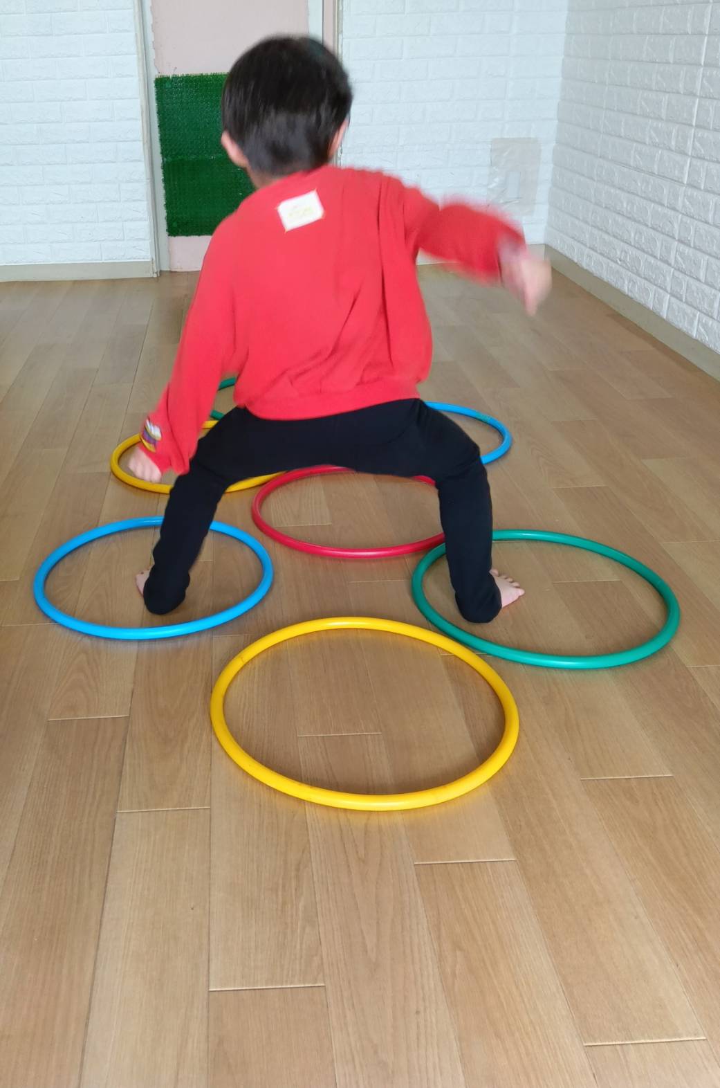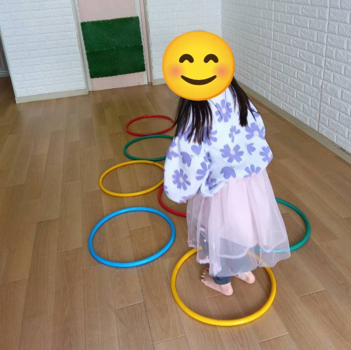 ケンパケンパ🦶 ワクワク 2026.02.12 こんにちは。フラフープケンケンパをしたよ。 大きいお友達はフラフープひとつのところは片足で、ふたつのところは両足で着地します。 楽しそうに何度も飛ぶ姿が見られました✨️ やまもと