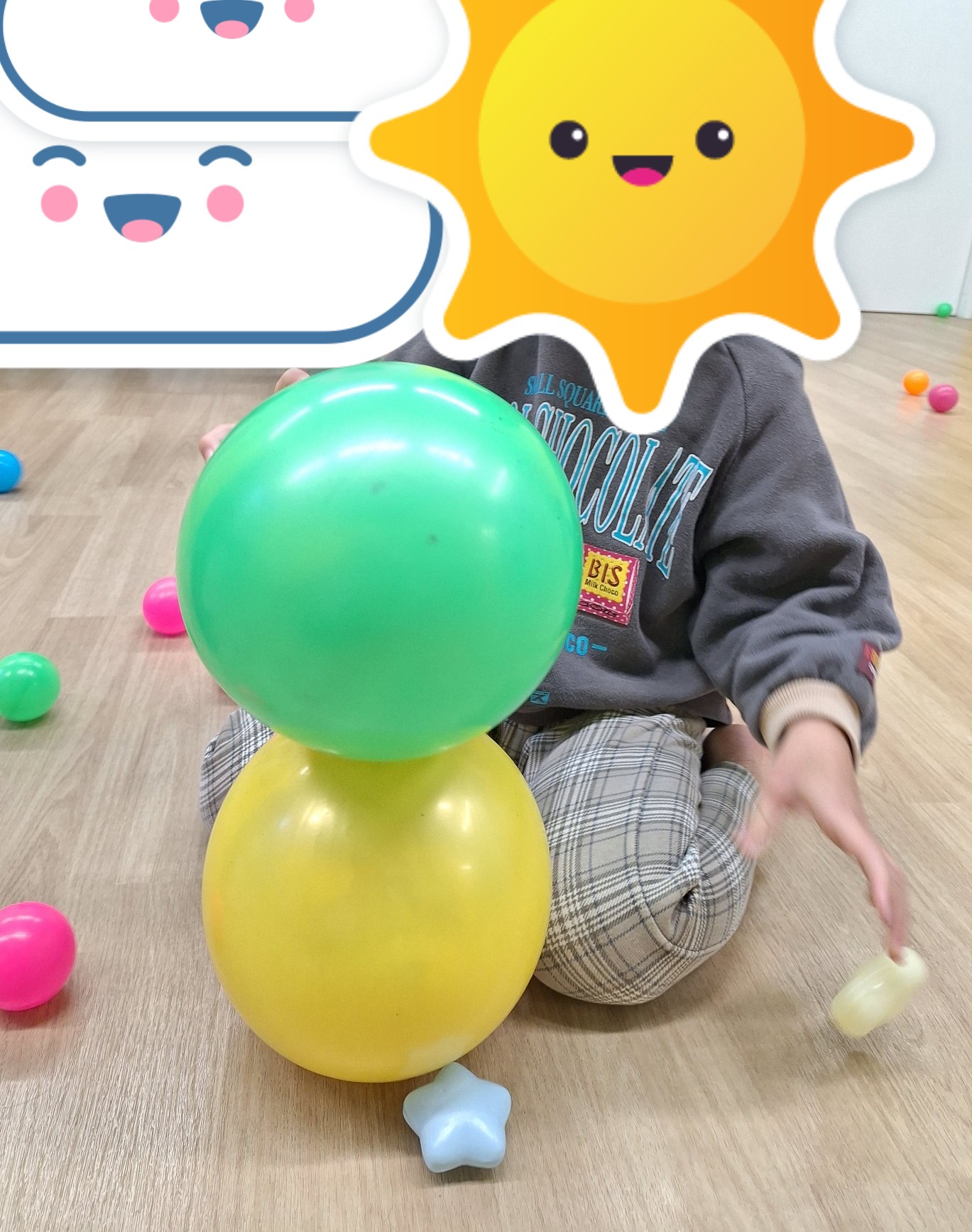 その後は、ボール遊びをしました。キャッチボールをしたり、投げたり、ボール滑り台をしたり、カゴのたくさんのボールを集めて遊びました。