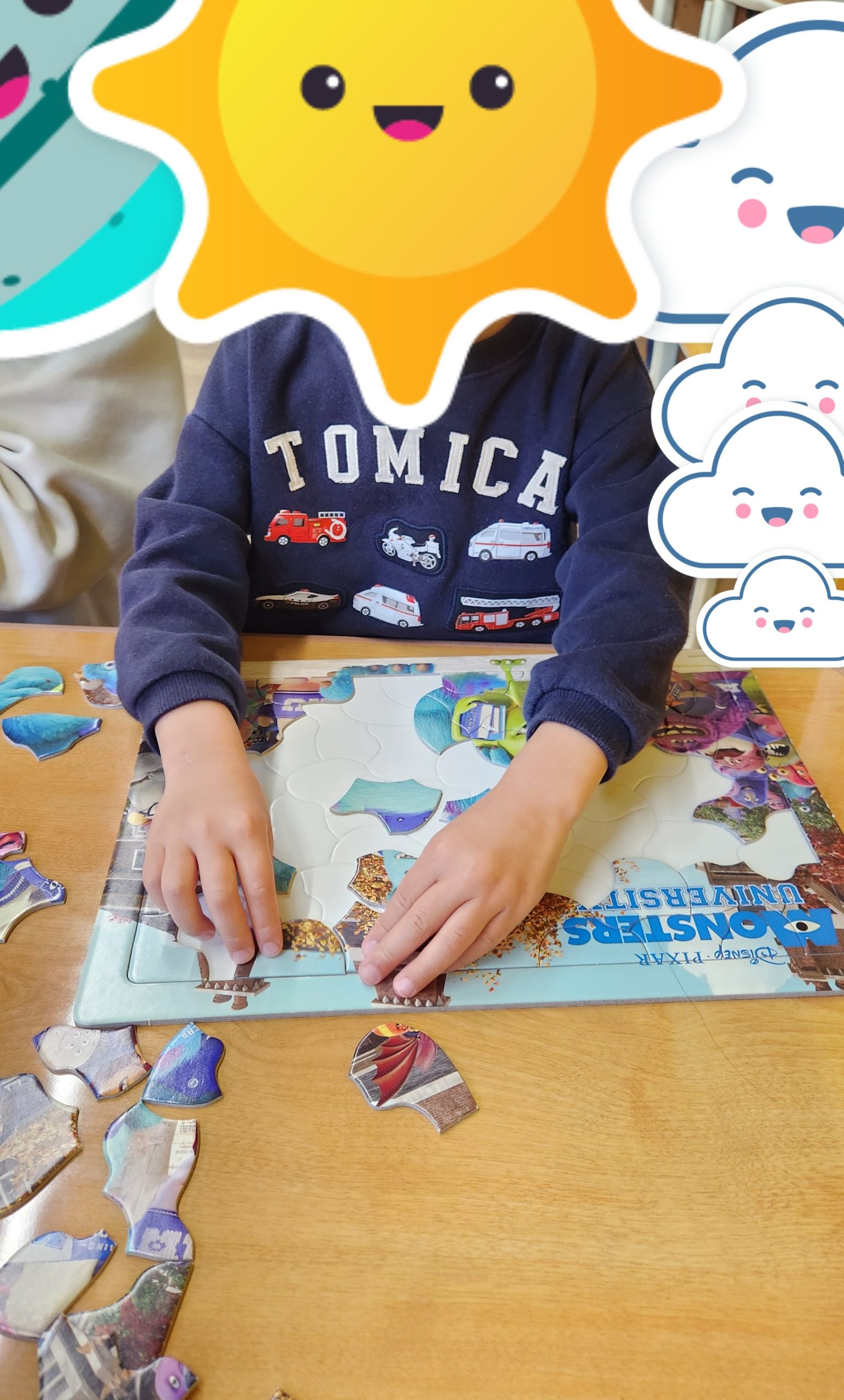 朝の会では、今日のお天気をみんなで確認しています。「朝は雨が降っていたよ」「来た時は曇りだった」「今は晴れているよ」とお天気マークが3つ並びました。いつもは1つの事が多いので、お天気の変化も楽しめていましたよ。